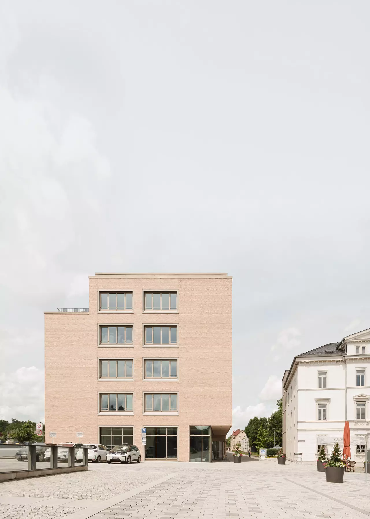 Maßgeblich für die Planung waren zudem die städtebaulichen Rahmenbedingungen. Der Haupteingang fungiert als wichtige Nahtstelle zwischen Gebäude und Bahnhofsplatz und wurde dementsprechend akzentuiert. Die Eingangshalle sollte ursprünglich das neue Bürgerbüro beherbergen und wurde mit einer höheren Raumhöhe geplant als die restlichen Etagen. Damit die MitarbeiterInnen vom beidseitig verlaufenden Auto- und Fußgängerverkehr geschützt sind, ist das Erdgeschoss als Hochparterre ausgebildet.