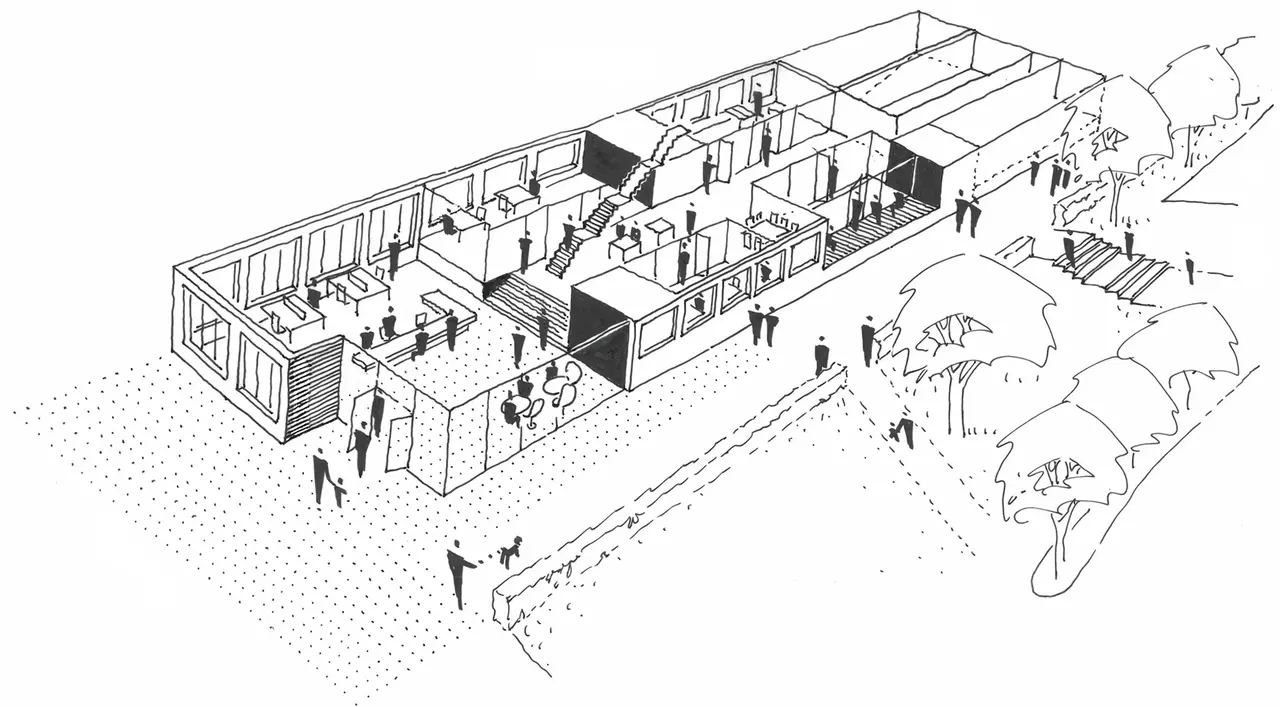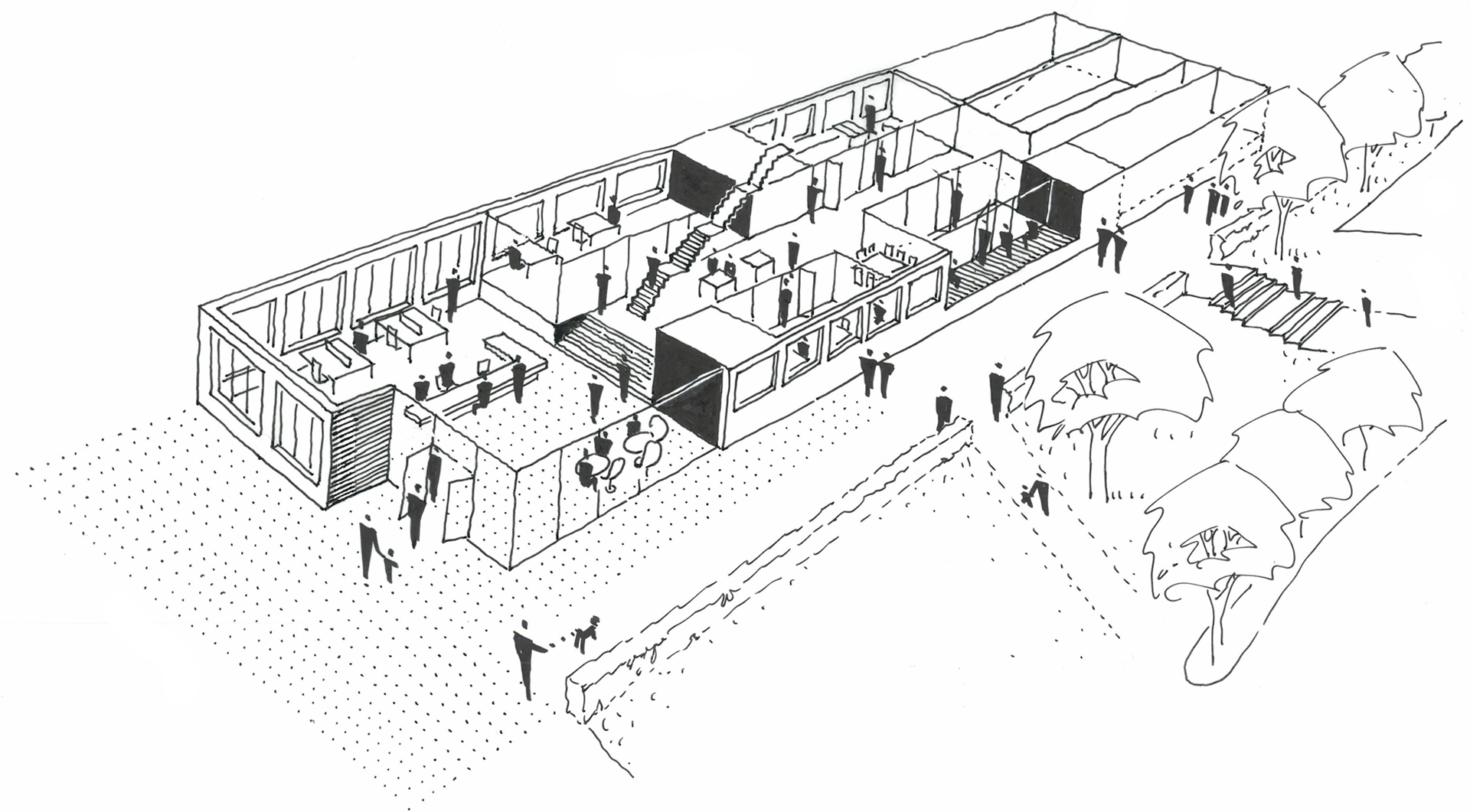 Trotz erheblicher Umbauarbeiten, die dieser nicht absehbare Nutzerwechsel erforderte, blieben die wesentlichen architektonischen Elemente erhalten: Von außen die skulpturale Ausformung des langgezogenen Baukörpers, im Inneren die einläufige Treppe, die das gesamte Gebäudevolumen erschließt. Sie macht den Bau über alle Stockwerke erlebbar, schafft wichtige Sichtachsen und bildet zudem eine verbindende Kommunikationszone.