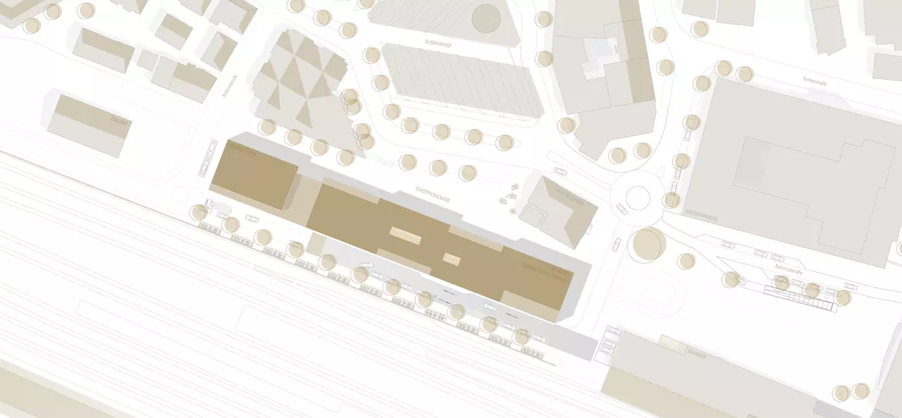 Der Neubau des Städtischen Verwaltungszentrums liegt in zentraler Lage der Innenstadt und ist als direkter Nachbar des Göppinger Bahnhofs ein wichtiger Bestandteil der „Neuordnung Bahnhofsumfeld“ aus dem Masterplan zum Stadtentwicklungsprozess Göppingen 2030. Städtebaulich markiert der langgestreckte, viergeschossige Neubau einen wesentlichen Impuls zur Verbesserung des Bahnhofsumfeldes. Parallel zur langgestreckten Nordfassade soll der Beginn einer Fußgängerpromenade entstehen, die in einen revitalisierten Stadtbereich führt.