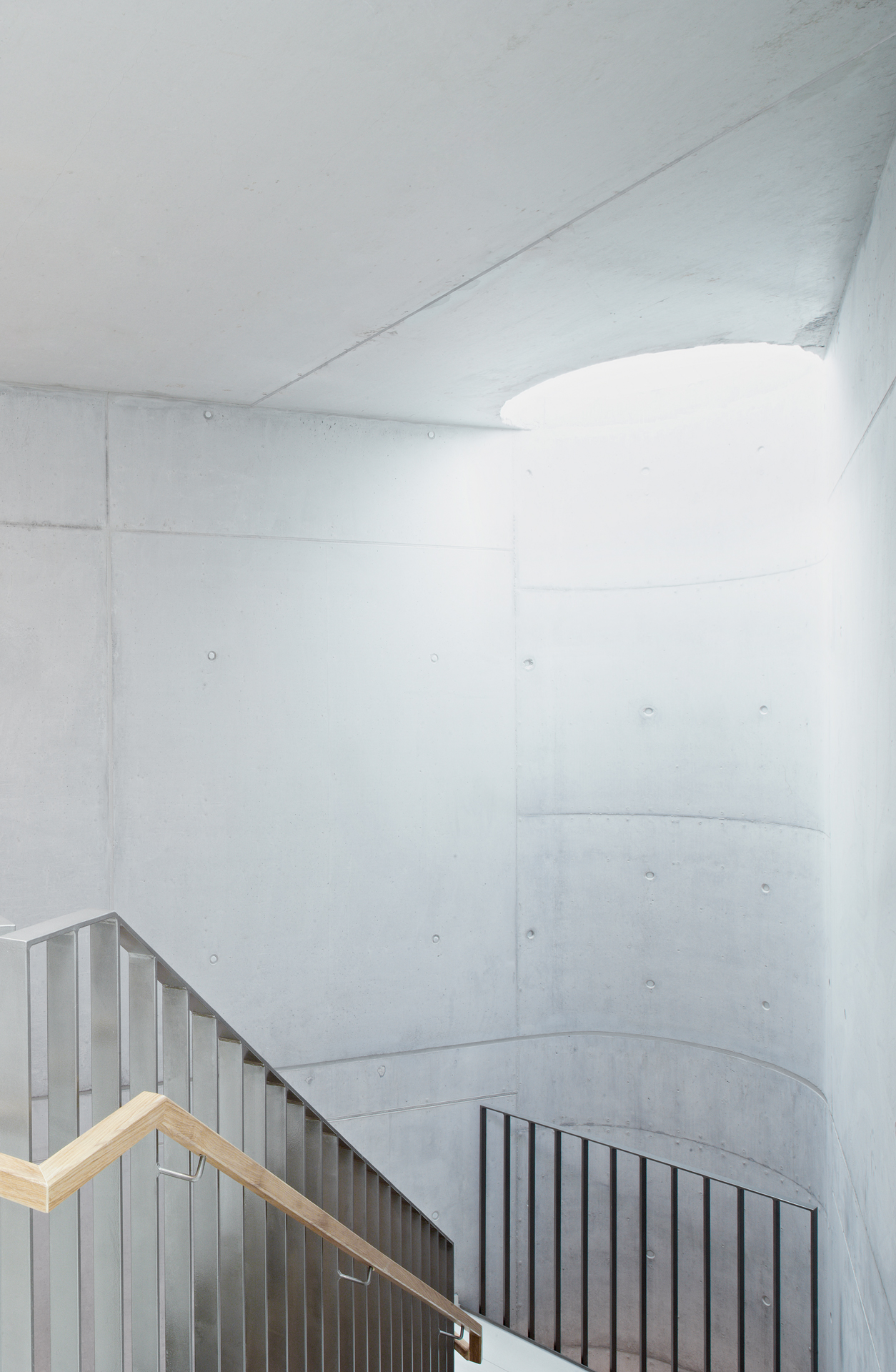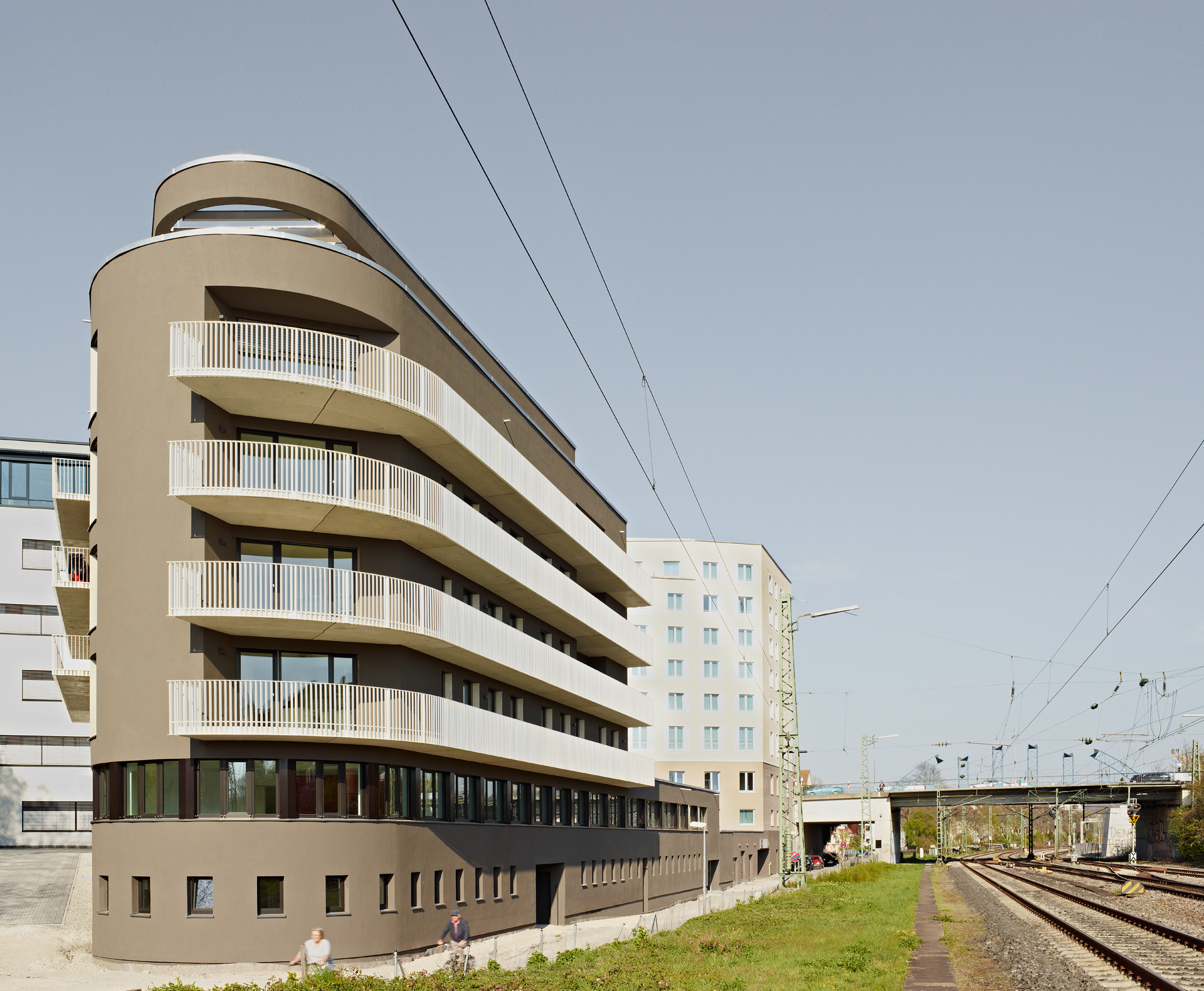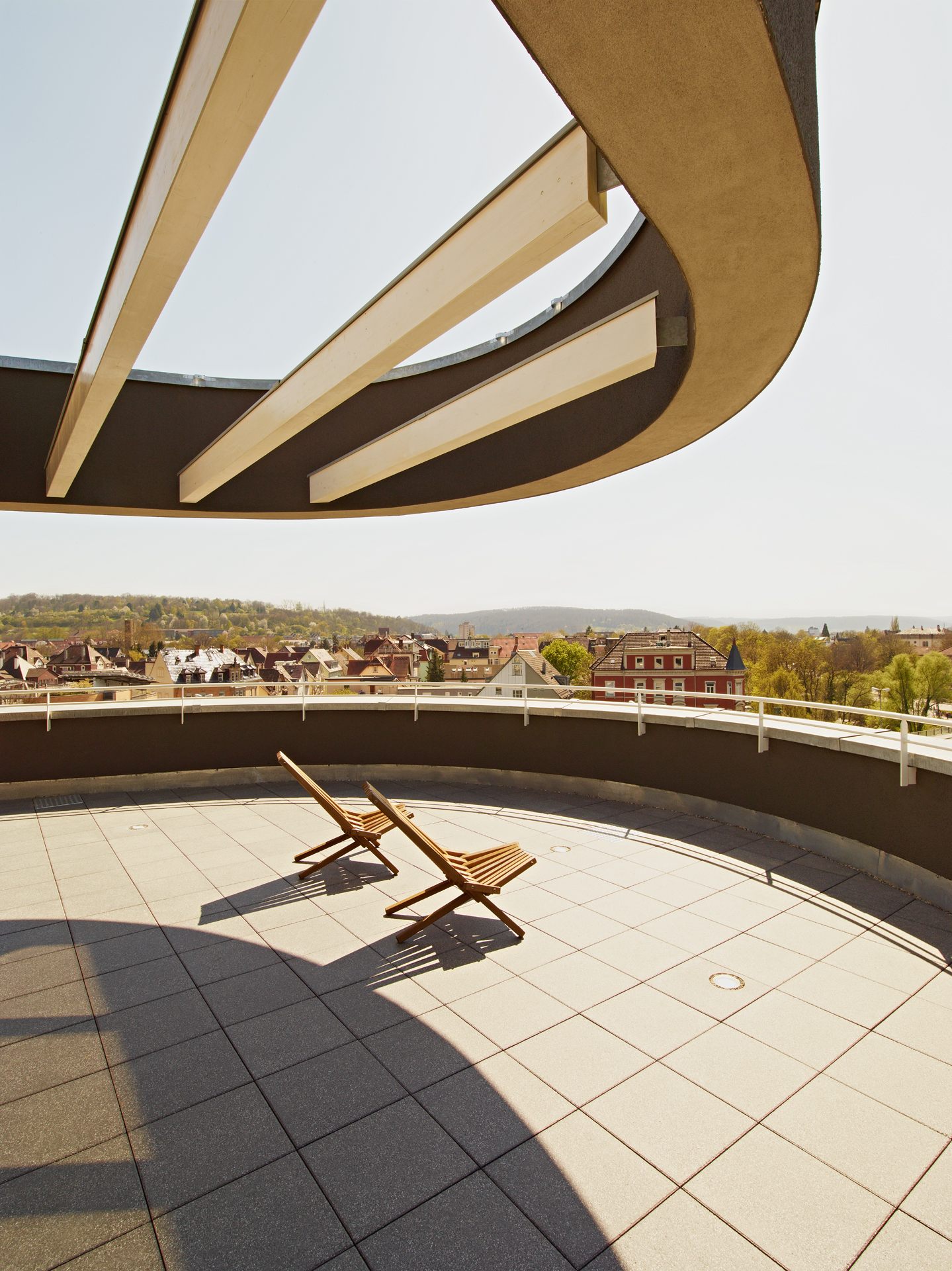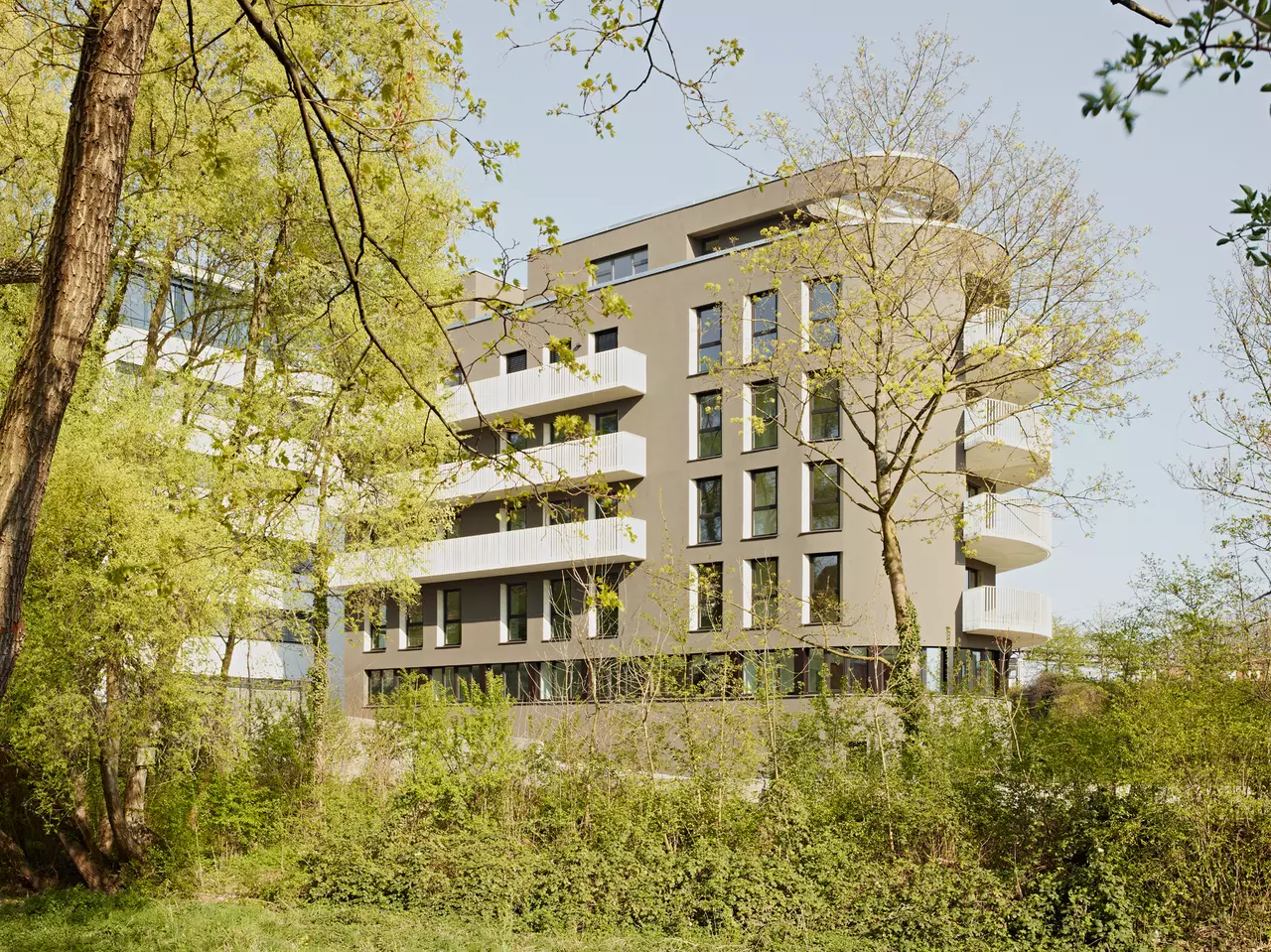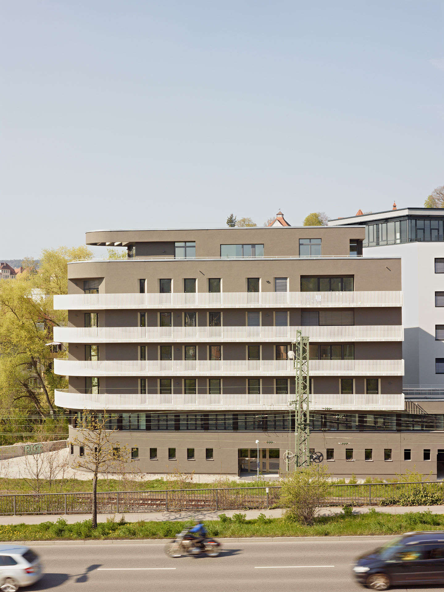 An der Blauen Brücke, dem markantesten Verkehrsknotenpunkt in Tübingen, befindet sich neben einem neuen Hotel und einem Gewerbebau der 6-geschossige Bau einer Baugemeinschaft. Vor den dunklen Putzflächen und Fenster mit schrägen, metallfarbenen Laibungen liegt eine weiße, filigrane Schicht aus umlaufenden Balkonen. Bemerkenswert sind die innovativen Senioren-Wohngemeinschaften, die neben einem Sprachinstitut und weiteren Wohnungen eine bunte städtische Mischung ergeben.