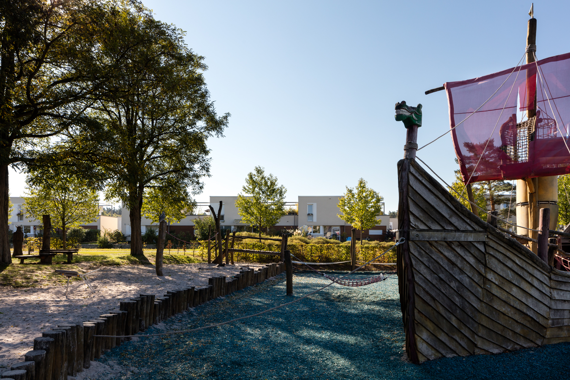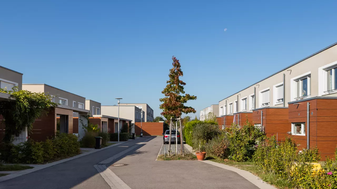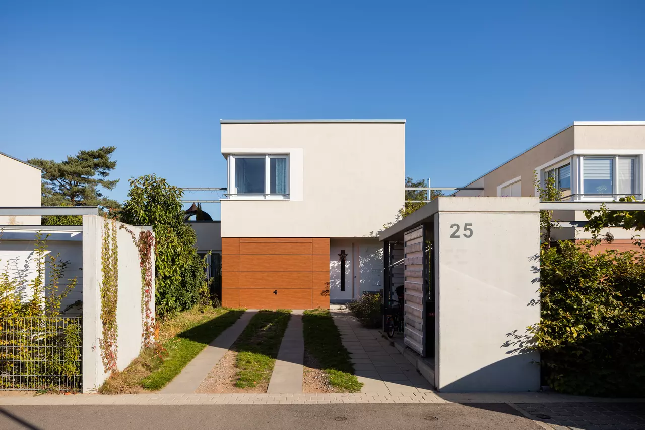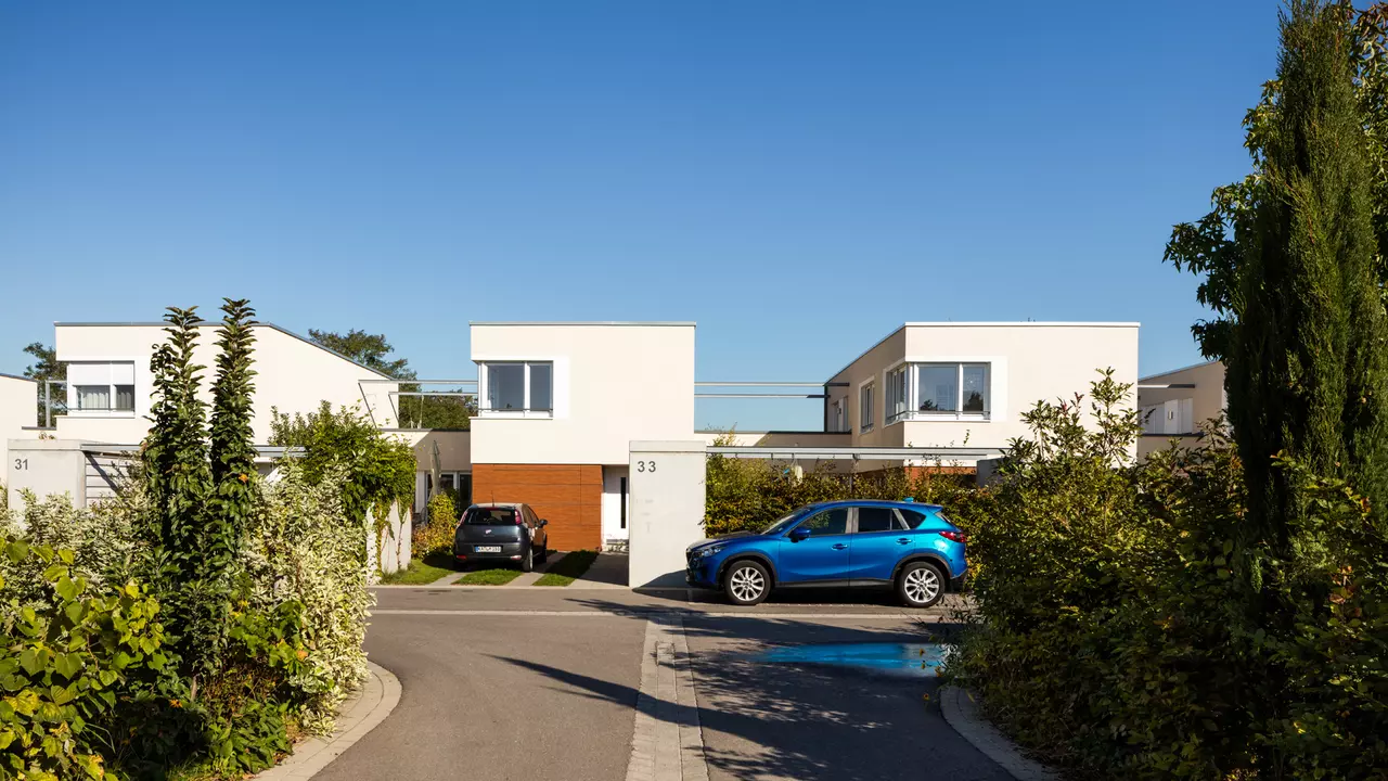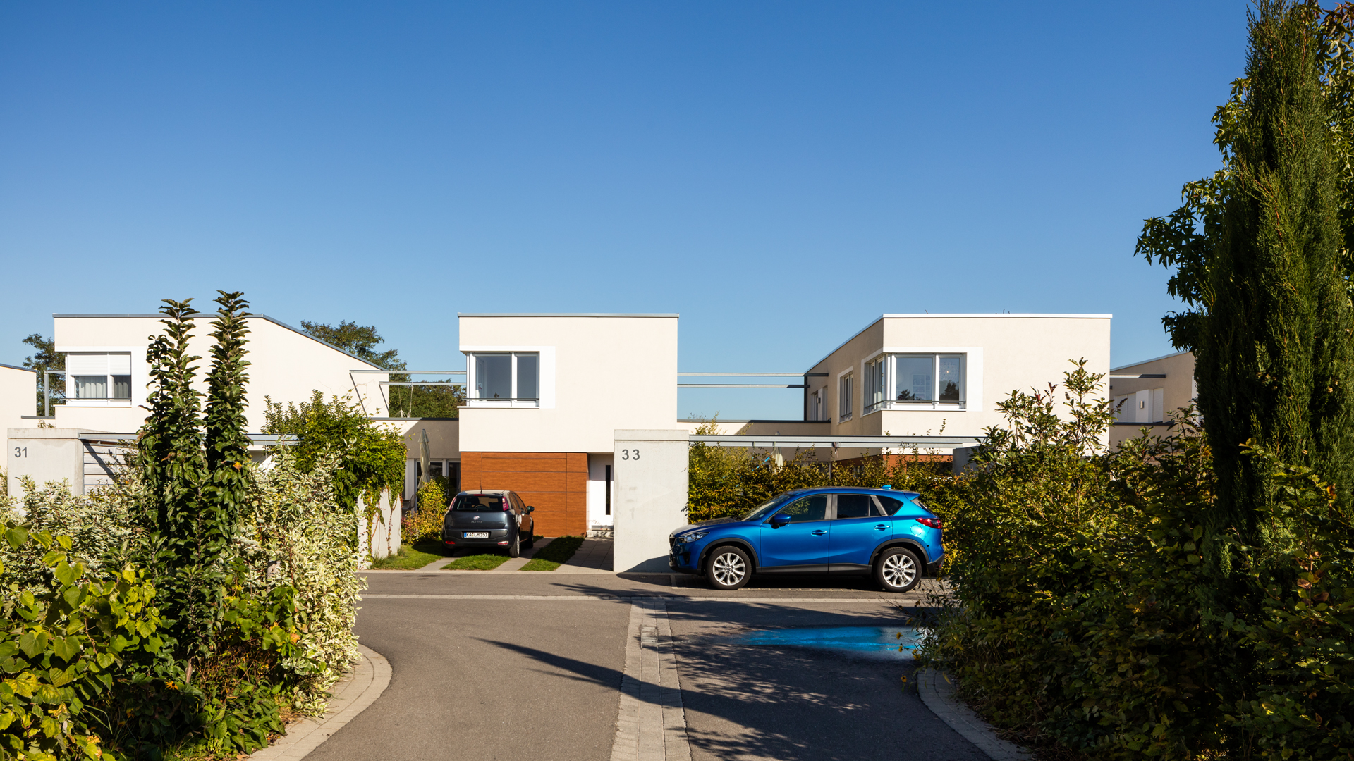Zur Erschließungsstraße im Westen schützen Geschosswohnungsbauten vor Schallimmission, zum Naturraum und Wald im Osten lockert sich die Bebauung auf. Das Baufeld wurde mit einem einheitlichen Raster überzogen, um eine hohe Flexibilität in der Vermarktung zu erzielen. Ein modulares "Baukastensystem", bestehend aus dem Basismodul und Zusatzbausteinen, die in unterschiedlichen Kombinationen diverse Haustypen generieren, reagiert auf unterschiedliche Nachfrage. Durch die Winkelhäuser an den Rändern des Baufeldes ist eine großzügige Durchlässigkeit zum Grünraum entstanden.