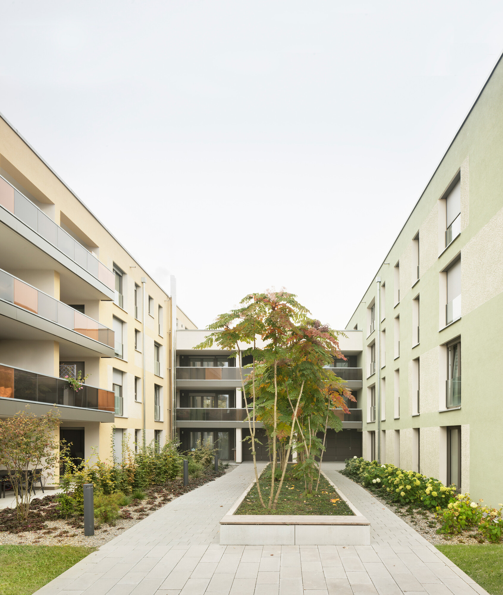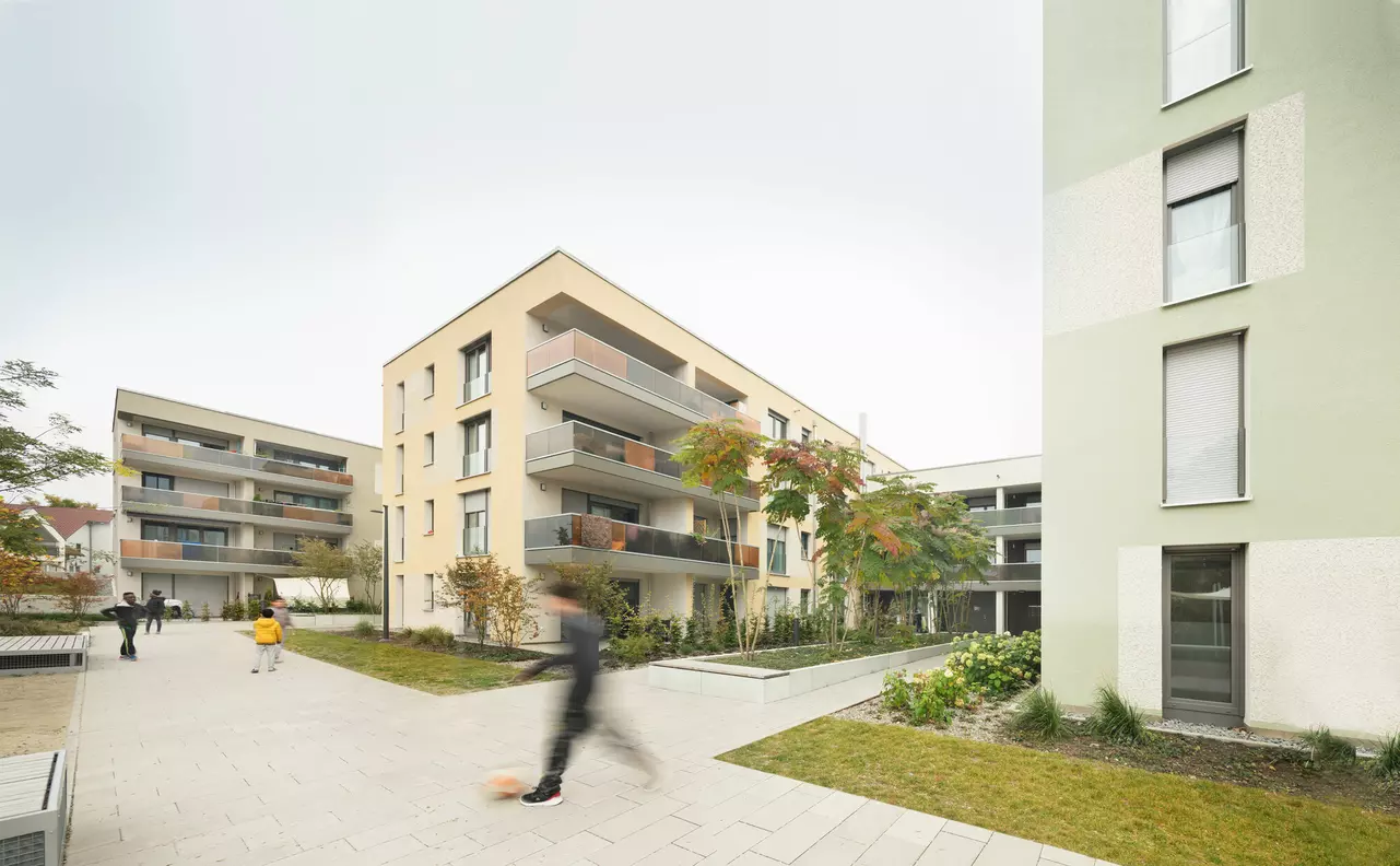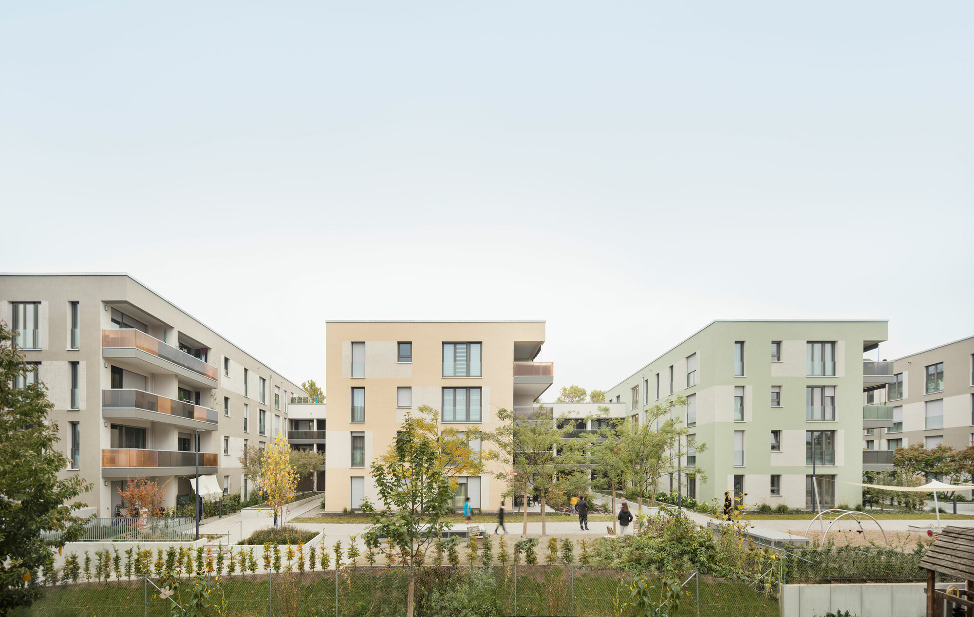 Am Ortseingang in Fellbach-Schmiden ist unter dem Schwerpunkt „Wohnen für Alle“ ein autofreies Wohnquartier entstanden. Mit insgesamt 70 Wohnungen, einem Gemeinschaftsraum und einer Tiefgarage werden Eigentums-, Miet- und geförderte Wohnflächen unter vier Dächern vereint. Schmale Verbindungsbauten verknüpfen die vier Gebäuderiegel, bilden einen Rücken zur Straße und ermöglichen ruhiges Wohnen im Quartiersinneren. Die verputzten Hauptkörper werden durch unterschiedliche Putzstrukturen und Farben gegliedert, im Kontrast dazu steht die zurückspringende horizontale Bandfassade. Der gemeinsame Freibereich im Norden des Grundstücks dient neben der Erschließung als sozialer Treffpunkt und Spielplatz mit hoher Aufenthaltsqualität.