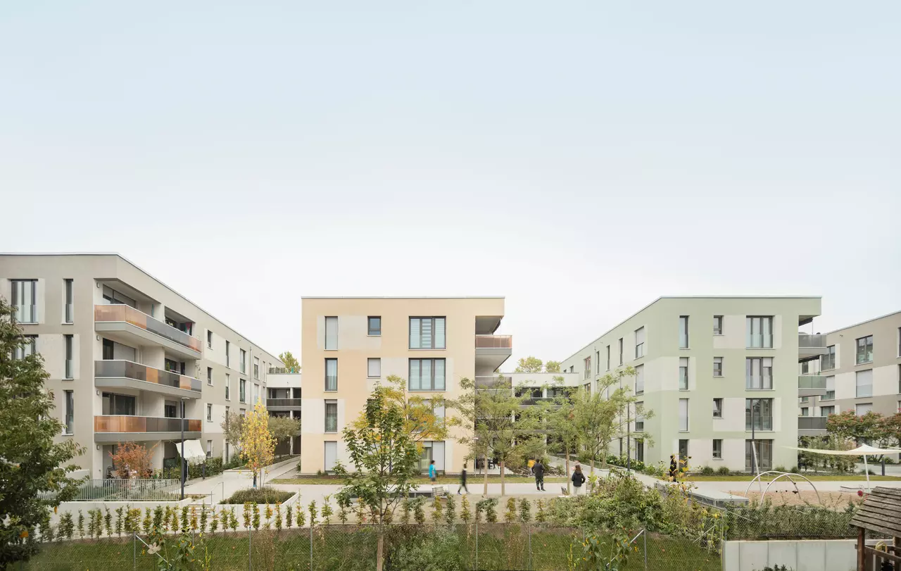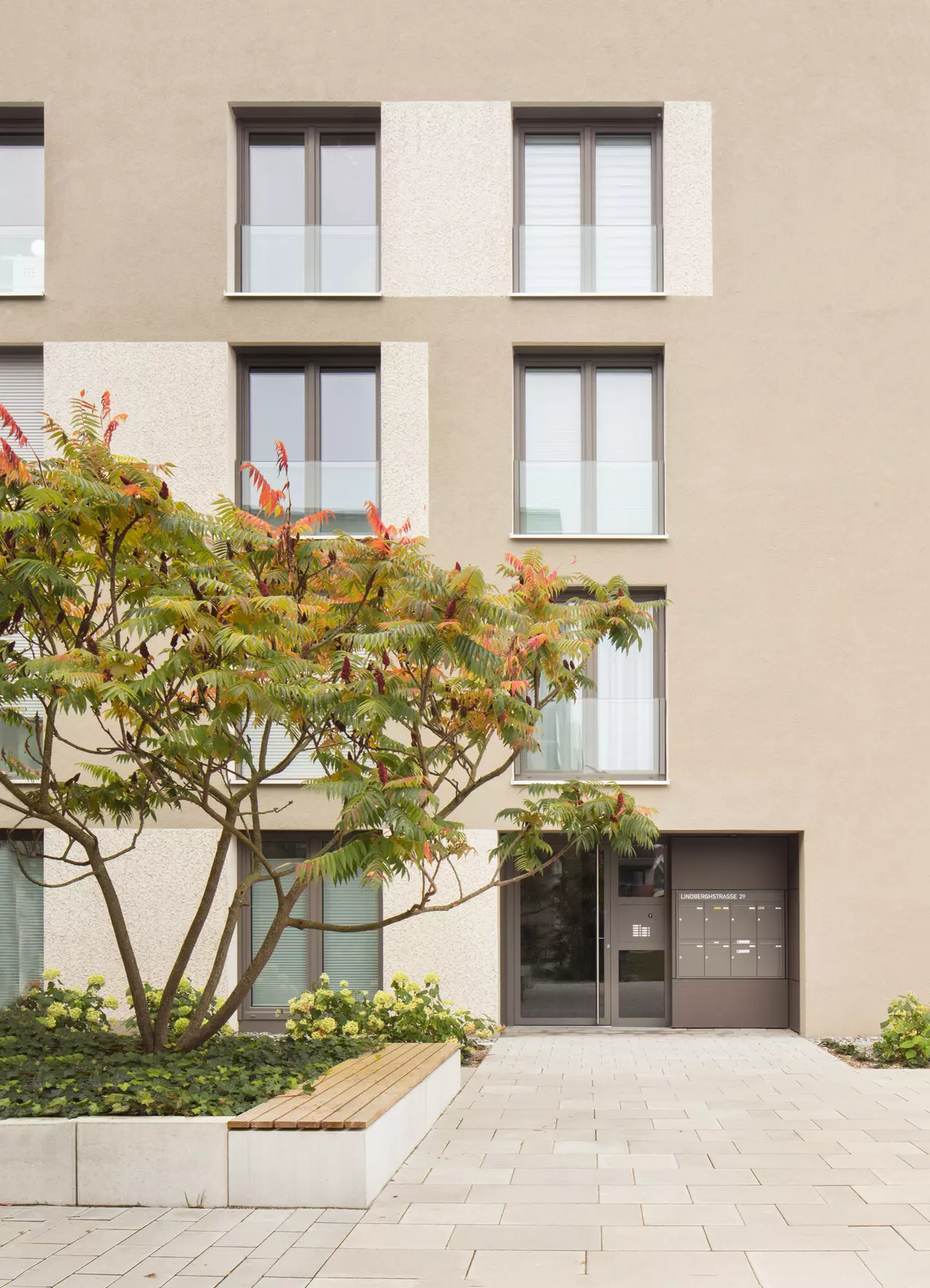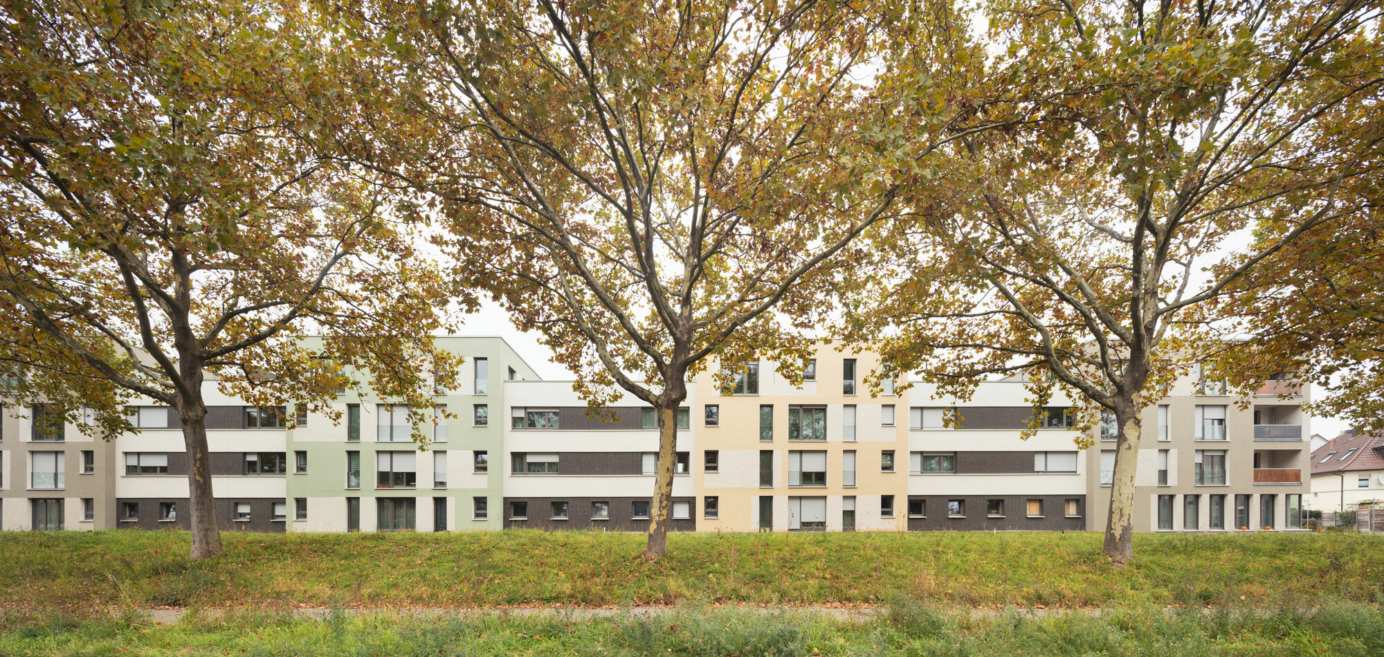 Am Ortseingang in Fellbach-Schmiden ist unter dem Schwerpunkt „Wohnen für Alle“ ein autofreies Wohnquartier entstanden. Mit insgesamt 70 Wohnungen, einem Gemeinschaftsraum und einer Tiefgarage werden Eigentums-, Miet- und geförderte Wohnflächen unter vier Dächern vereint. Schmale Verbindungsbauten verknüpfen die vier Gebäuderiegel, bilden einen Rücken zur Straße und ermöglichen ruhiges Wohnen im Quartiersinneren. Die verputzten Hauptkörper werden durch unterschiedliche Putzstrukturen und Farben gegliedert, im Kontrast dazu steht die zurückspringende horizontale Bandfassade. Der gemeinsame Freibereich im Norden des Grundstücks dient neben der Erschließung als sozialer Treffpunkt und Spielplatz mit hoher Aufenthaltsqualität.